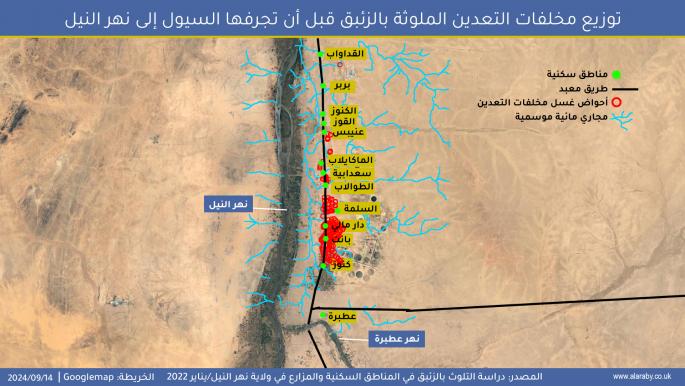 وتجمع مصادر التحقيق على أن مخلفات التعدين جرفتها السيول المتدفقة من السلسلة الجبلية لشرق ولاية نهر النيل، عبر عدة أودية، منها وادي الحمار وخور أمور، وبالطبع فإنها ملوثة بالزئبق، كما يؤكد الناشط البيئي في مبادرة مكافحة آثار التعدين (مستقلة)، وليد محمد، الذي شاهد في أغسطس الماضي برك المياه في سوق أبو حمد وقد تغير لونها إلى الأحمر والأصفر بدلا من الأخضر (لون البرك الطبيعي الناتج عن الطحالب)، ويفسر الدكتور صالح، وأحمد الوليد، أستاذ الهندسة الكيميائية بجامعة الخرطوم، وبشري حامد، الأمين العام للمجلس الأعلى للبيئة والموارد الطبيعية الحكومي، تغيير لون المياه بأن اللونين الأحمر والأصفر سببهما المواد الملوثة (الزئبق)، والتي تمنع تكوين الطحالب في المياه، ويظهر لون التلوث حسب درجة سمية المواد.