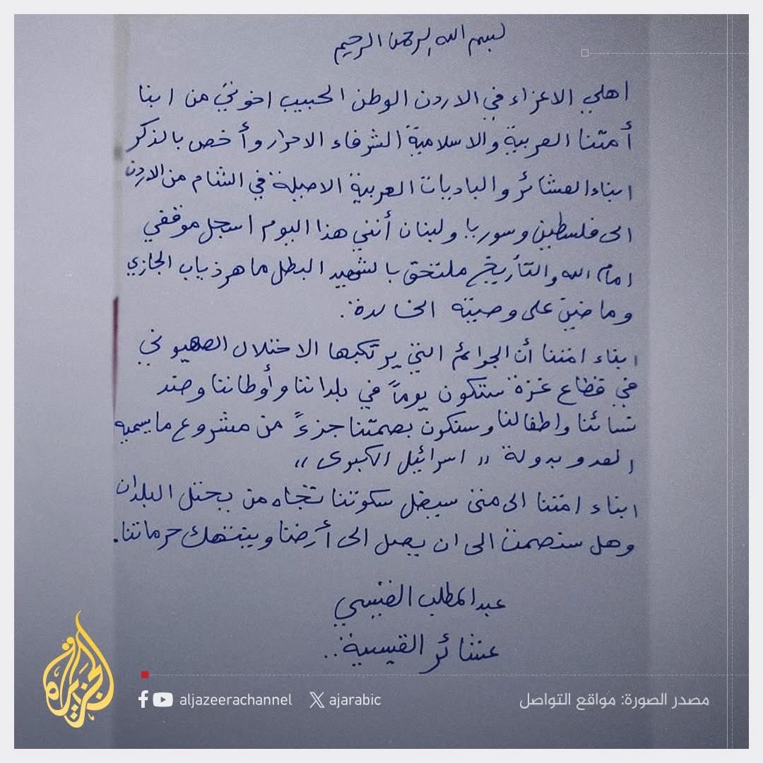 وصية مكتوبة بخط اليد منسوبة لمنفذ عملية “معبر الكرامة”: إلى متى سكوتنا...