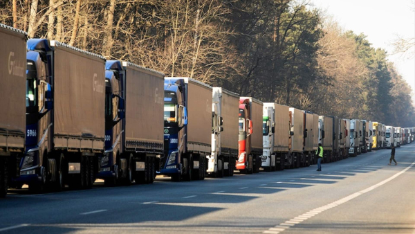 وارسو..بولندا : طابور شاحنات بضائع بطول 40 كلم على الحدود بين بولندا و...